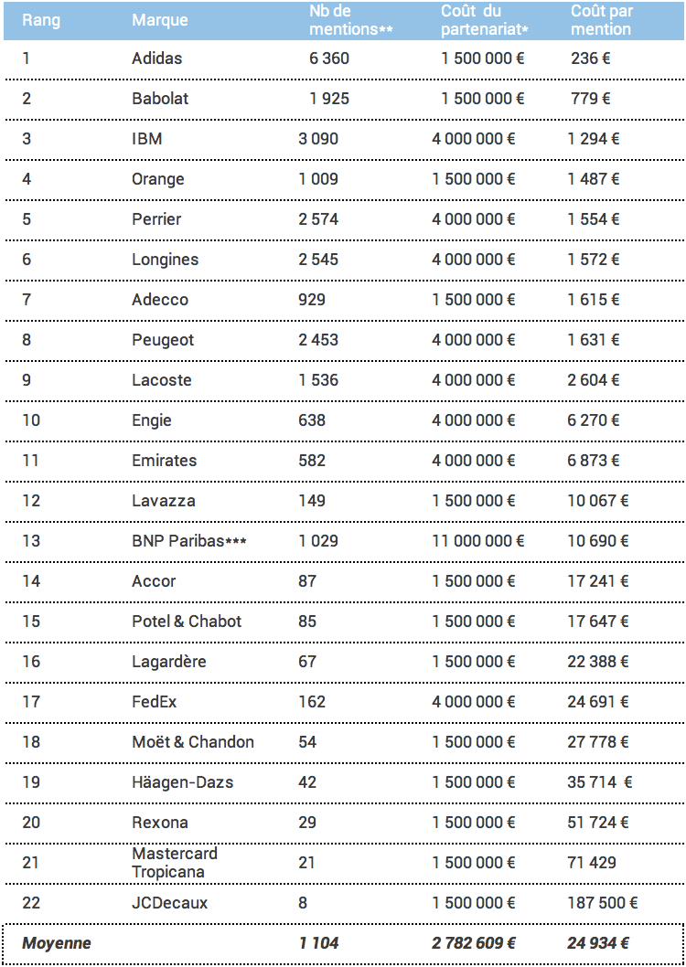 Ainsi, avec un coût par mention moyen de 24 934 €, Moët & Chandon, Häagen-Dazs, Rexona, Mastercard, Tropicana et JCDecaux semblent surpayer leur partenariat avec Roland-Garros.
