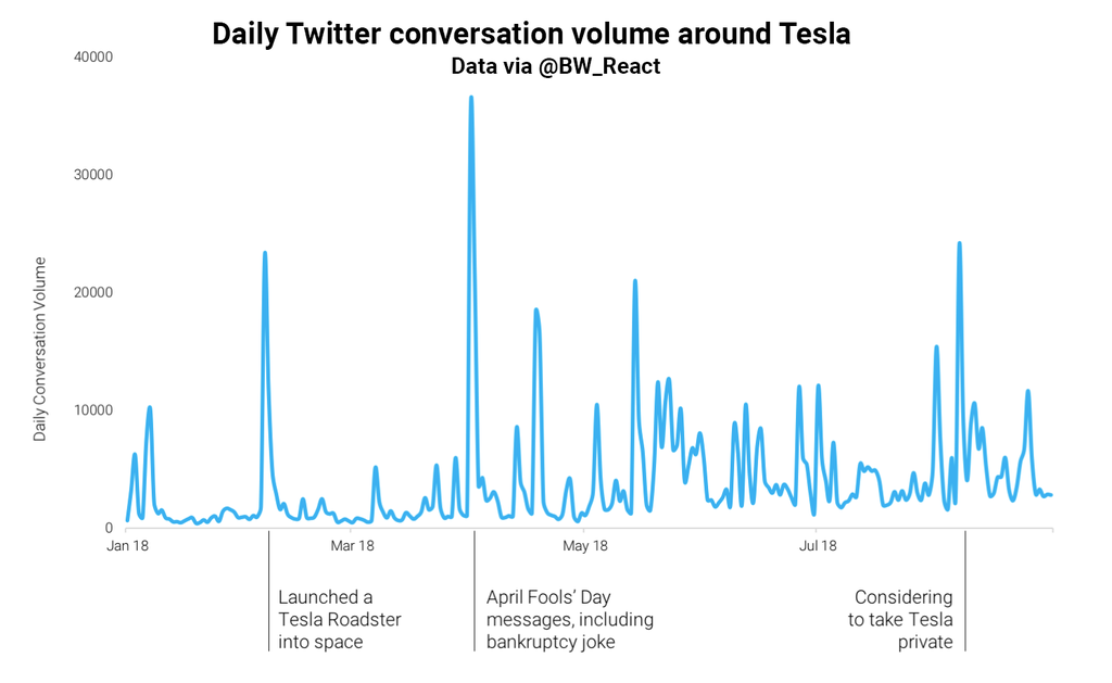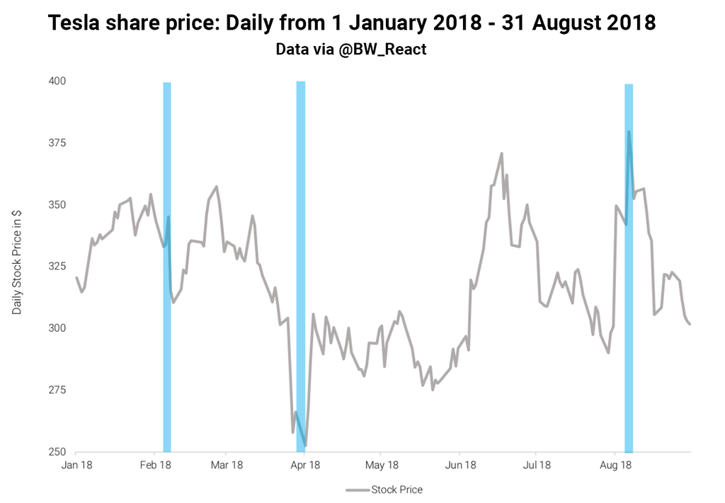 Lorsqu'Elon Musk a tweeté au sujet de la privatisation de Tesla, je me suis demandé dans quelle mesure les médias sociaux impactent le cours des actions boursière des entreprises ? J'ai combiné les données Twitter à celles du cours de l'action Tesla pour trouver une réponse.