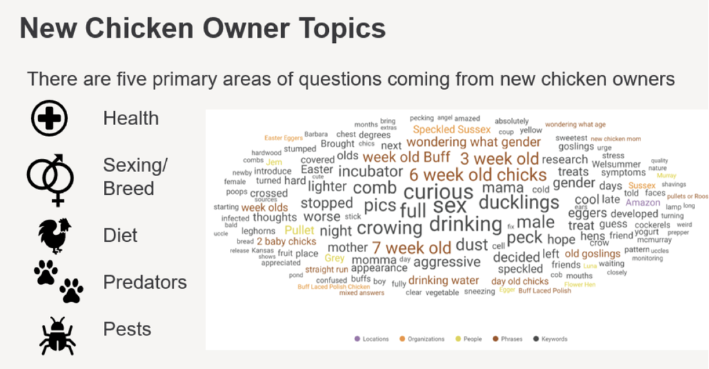 • Analyse approfondie de l’audience : l’équipe peut suivre les conversations des principaux groupes de consommateurs, tels que les nouveaux propriétaires de poulets ou les futurs agriculteurs et producteurs, afin de l’aider à élaborer sa stratégie de contenu.