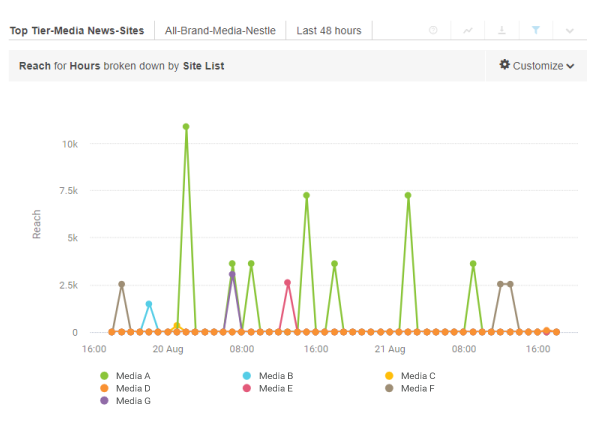 Afin d’obtenir un aperçu rapide de la pertinence d’un sujet émergent relatif à ses marques ou produits, Nestlé combine le Reach Score de Brandwatch avec l’analyse de sentiment afin de déterminer l’importance des mentions d’individus et d’évaluer avec précision le déroulement des discussions.