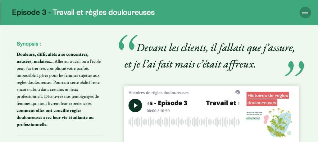 - Nourrir le fil directeur de 4 épisodes de podcasts réalisés en collaboration avec des médecins, prévus pour accompagner le lancement produit. Le but étant de se concentrer sur les thématiques les plus évoquées dans les conversations.