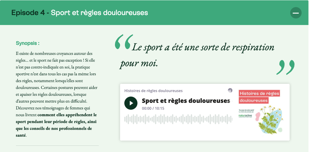 - Cumuler vie professionnelle et activités sportives pendant les menstruations sont une priorité. Ces deux sujets sont repris dans les thèmes des podcasts.