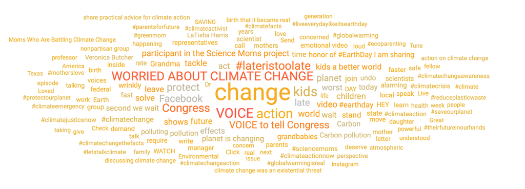 Première étape importante de la campagne Science Moms : comprendre comment le changement climatique était abordé sur Internet. En général, les discussions en ligne sur les politiques climatiques tournent autour de sujets tendance comme le Green New Deal. On y trouve aussi beaucoup de craintes liées au climat, par exemple dans les conversations autour du réchauffement de la planète et des conditions météorologiques extrêmes qui provoquent l'extinction d'espèces animales et végétales, les incendies de forêt et la raréfaction de l'eau potable.