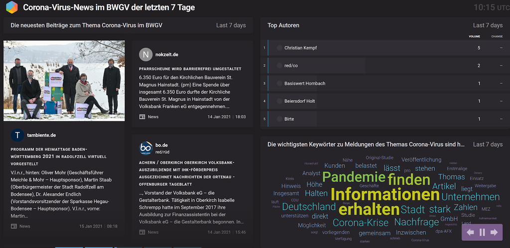 Les banques de l'association BWGV sont ainsi restées informées en temps réel des derniers développements dans leur région. Grâce à la flexibilité des rapports Vizia, de nouvelles diapositives peuvent être créées en réaction aux plus récents insights et développements. Le « Coronavirus Radar », qui montre les messages, les auteurs et les mots clés les plus importants sur le thème du Covid-19 dans le Bade-Wurtemberg, illustre cela à la perfection.