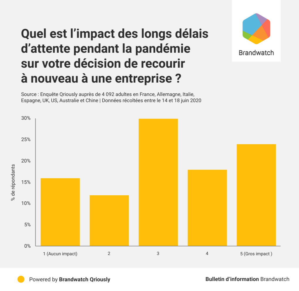 En ce qui concerne les longs délais d’attente, les consommateurs restent plutôt neutres avec 60 % des répondants ayant opté pour un score entre 2 et 4. Cela étant dit, 24 % ont déclaré que de longs délais d’attente auraient un gros impact (ce qui représentent une part non négligeable de la clientèle).