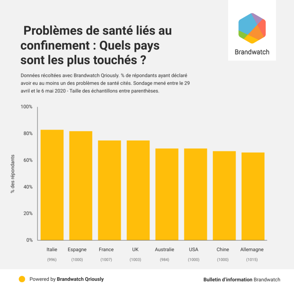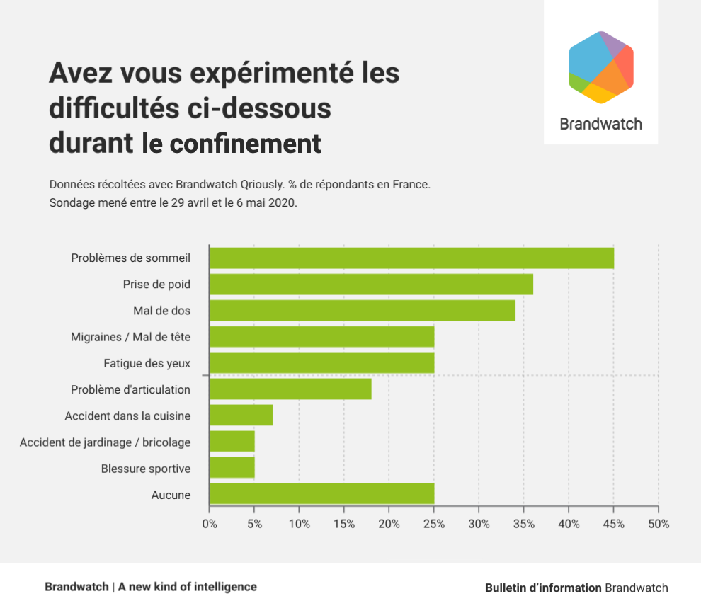 Les troubles du sommeil (45 % ), la prise de poids (36 %) et le mal de dos(34 %) sont les 3 problèmes de santé les plus répandus chez les répondants français. L’adaptation à un mode de vie plus sédentaire, peut en partie expliquer ces résultats.