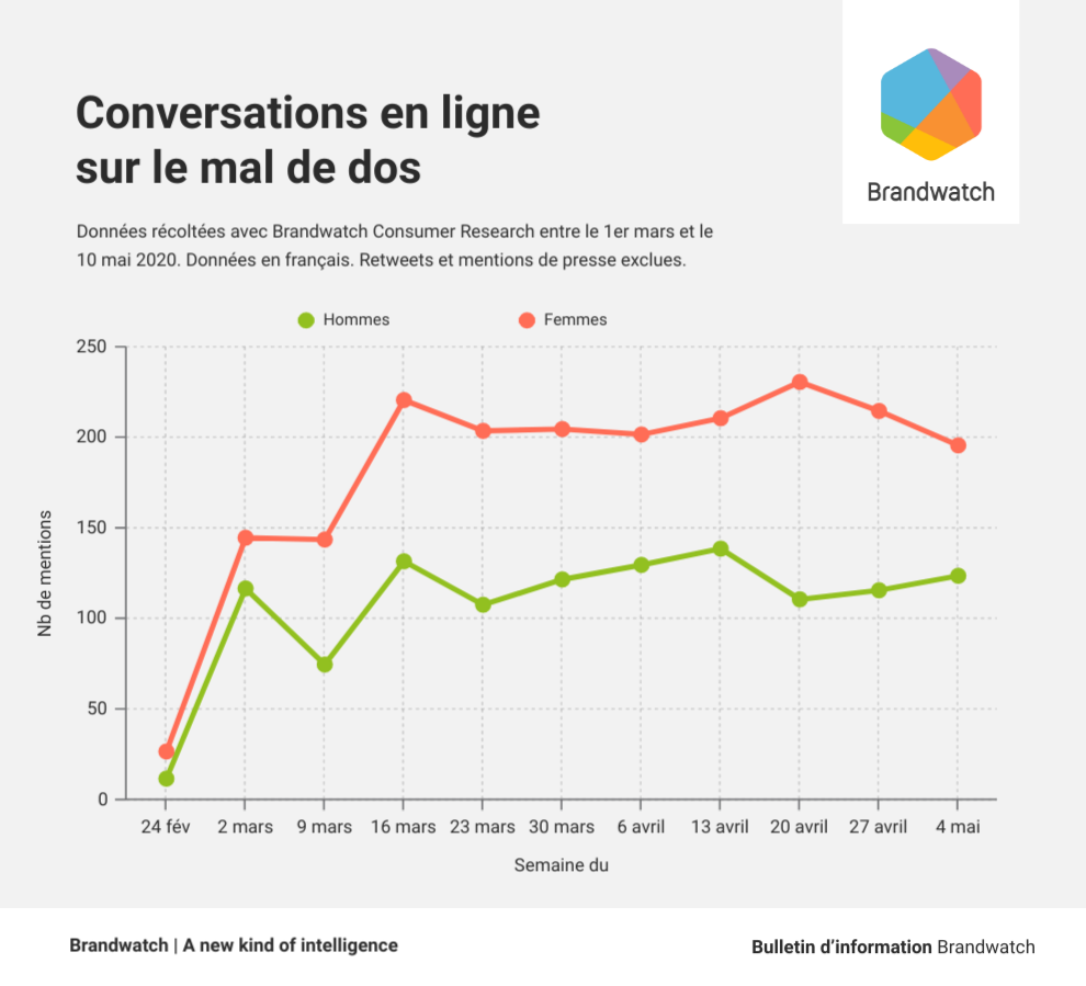 En examinant les discussions en lignes sur le mal de dos et/ou de nuque, nous avons observé une augmentation soudaine des mentions au début du confinement qui s’est maintenue tout au long des mois de mars et avril.