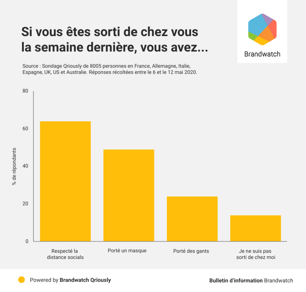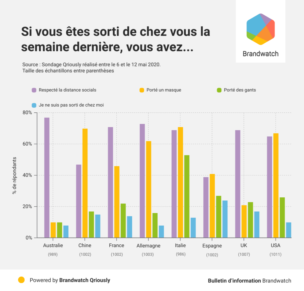 Bien entendu il existe des directives officielles, mais nous avons en savoir plus sur les précautions réellement prises par le public lors de leur sorties en public à l’aide de Qriously. Pour ce faire nous avons interrogé 8 005 personnes en France, Allemagne, Espagne, Italie, UK, US, Australie et Chine.
