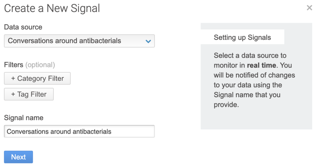 Étape n°1 : pour créer un nouveau signal, vous avez simplement besoin d’une requête (une recherche vous permettant de détecter des mentions sur un sujet, une marque ou un produit). Vous pouvez également ajouter des filtres, mais dans votre cas, il se révèlera sûrement très intéressant de faire la recherche la plus « ouverte » possible : après tout, vous êtes en quête de tendances inconnues !