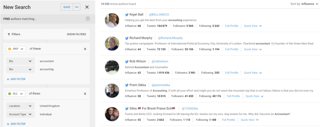 Par exemple, si votre public cible est constitué de comptables basés au Royaume-Uni, vous pouvez effectuer une recherche au sein de Social Panels afin de filtrer les auteurs et de ne garder que ceux dont la biographie contient les mots « comptable » ou « comptabilité », afficher les comptes individuels (par opposition aux entreprises) et ne garder que ceux situés au Royaume-Uni.