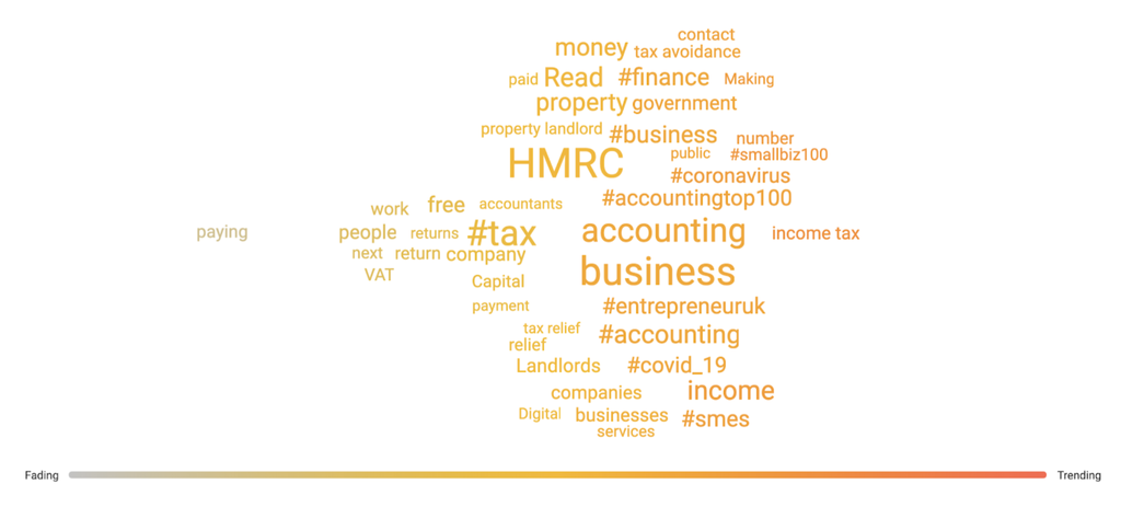 Voici, par exemple, ce que les comptables britanniques ont publié sur une période de deux semaines, durant le mois d’août. Les nombreuses options de visualisation de Brandwatch Consumer Research vous aident à voir non seulement ce dont les gens parlent actuellement, mais aussi les sujets en perte de vitesse ou les tendances plus stables. Tout est cliquable, vous comprenez donc rapidement à ce qui se cache derrière chaque mini-tendance.