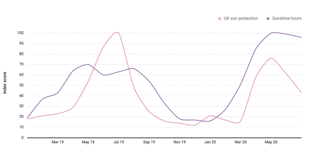 En voici un exemple très simple. En examinant les conversations sur les crèmes de protection solaire et les heures d’ensoleillement au Royaume-Uni entre janvier 2019 et juillet 2020, nous avons détecté une corrélation claire entre la quantité de soleil à laquelle les consommateurs sont exposés et leur intérêt pour la protection solaire.