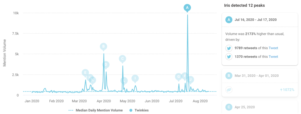 Vous pouvez même réaliser votre repérage avec un simple graphique linéaire. L’exemple ci-dessous montre l’évolution des mentions de Twinkies (biscuits américains) sur les médias sociaux entre le 1er janvier et le 11 août 2020.
