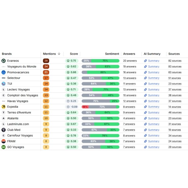 Certaines marques comme Expédia (18 % de sentiments négatifs) doivent être vigilantes à propos des narratifs renvoyés par les LLMs.