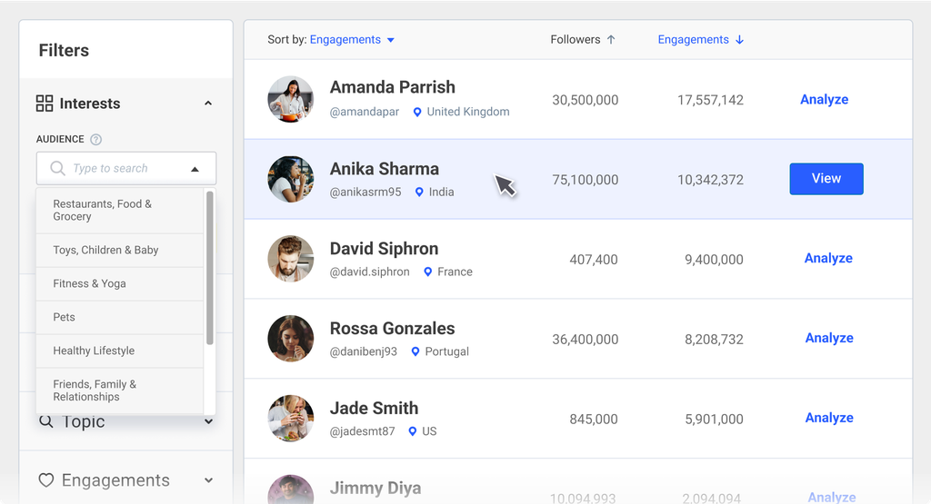 Filtrez par centres d'intérêt, affinités avec la marque, travail antérieur sur la marque, crédibilité, et plus encore.