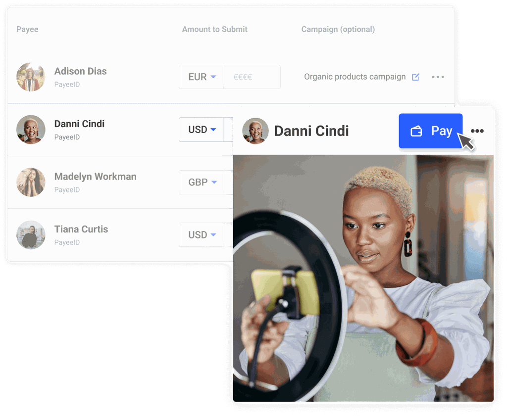 Rémunérez les créateurs dans plus de 120 devises. Associez les paiements aux influenceurs et aux campagnes pour obtenir un reporting en temps réel des dépenses et des performances de votre marketing d'influence.