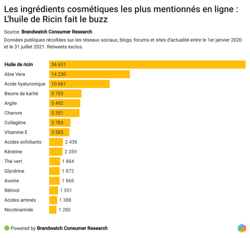 Sur la période analysée, l’ingrédient le plus mentionné de loin par les internautes est l’huile de ricin. Un rapide coup d'œil sur le composant Benchmark évoqué plus haut dans cette étude confirme qu'il s'agit de l'ingrédient ayant enregistré l'évolution la plus rapide.