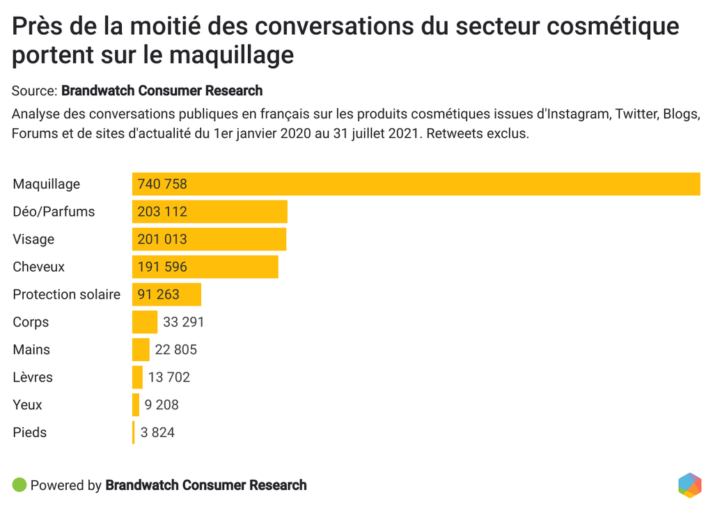52% de ces mentions sont générées par des femmes et 48% par des hommes. Ces conversations tournent autour de divers sujets de beauté et de produits cosmétiques comme le maquillage, les soins du visages et les parfums.