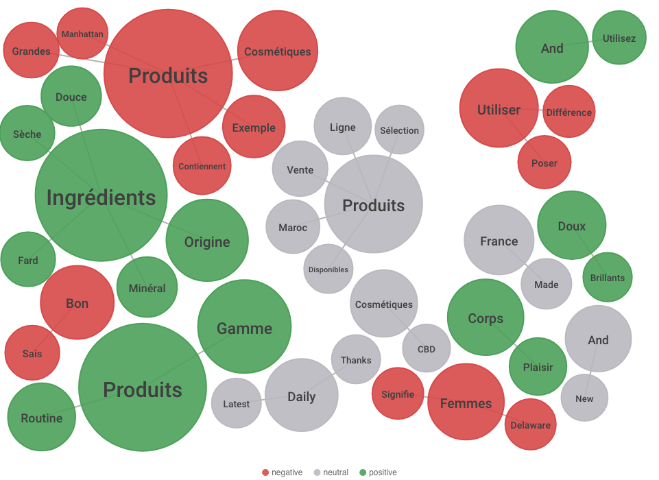 Le Topic Cluster montre également que 20% des mentions ont un sentiment négatif. Ces dernières se concentrent également autour des ingrédients de produits cosmétiques, que certains consommateurs trouvent agressifs pour la peau, voire même dangereux pour la santé. Ces consommateurs partagent donc des produits alternatifs dont les ingrédients naturels respectent et réparent la peau.
