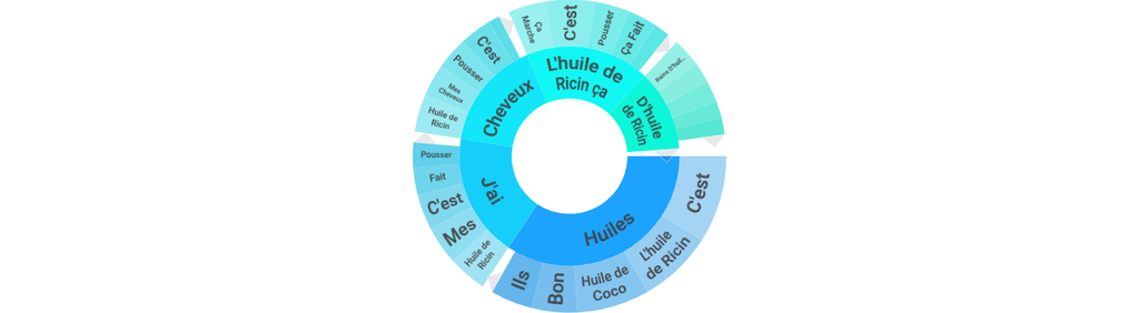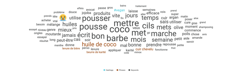 La fonction Topic Wheels et le nuage de mot offrent une représentation des mots et des phrases fréquemment utilisés en rapport à une thématique. En appliquant un filtre pour analyser uniquement les conversations relatives à l'huile de ricin, on peut identifier les différentes utilisations de cet ingrédient tendance par le public.