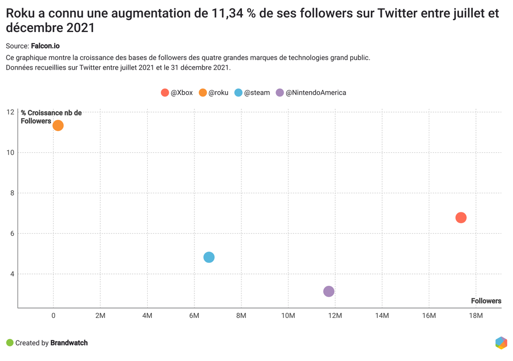 Si une marque a vu sa croissance boostée par la pandémie, c'est bien Roku. Ce phénomène s'est également étendu à ses followers, Roku ayant connu une augmentation de 11,34 % du nombre de ses followers Twitter entre juillet et décembre 2021. Il s'agit certainement de la plus forte croissance sur Twitter au sein de ce groupe, bien que la marque soit encore émergente sur la plateforme.