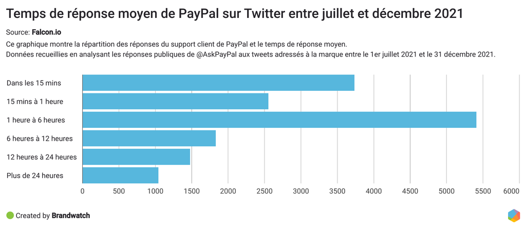Ces organisations mettent également à profit leurs réseaux sociaux pour fournir un service clientèle rapide. PayPal, par exemple, dispose d'un compte Twitter dédié (@AskPayPal) en vue de proposer une assistance rapide à ses utilisateurs. Il est essentiel pour les marques œuvrant dans les services financiers d'avoir un temps de réponse moyen (ART) limité, et PayPal semble y parvenir. L'ART de la marque au cours du second semestre 2021 était de 7 h, 19 min, 25 s.