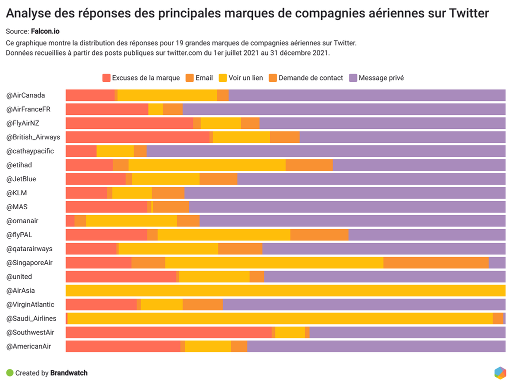 L'analyse des réponses des principales compagnies aériennes sur Twitter, réalisée à l'aide de Falcon.io, a montré qu'en dehors du texte brut, la demande d'envoi de message privé était le type de réponse le plus utilisé par les compagnies aériennes au second semestre 2021. Après tout, transférer les clients mécontents vers une messagerie privée est une excellente façon de fournir un meilleur service clientèle tout en éloignant les remarques négatives de l'attention du public.