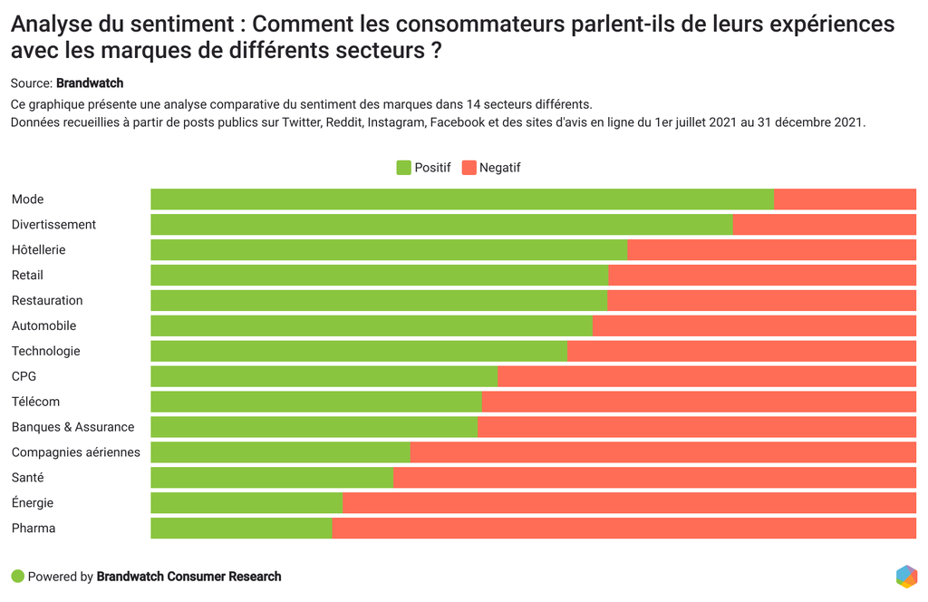 Les secteurs de l'alimentation, de la mode et du divertissement sont ceux qui ont généré le plus grand nombre de mentions positives comparées au nombre de mentions négatives reçues.