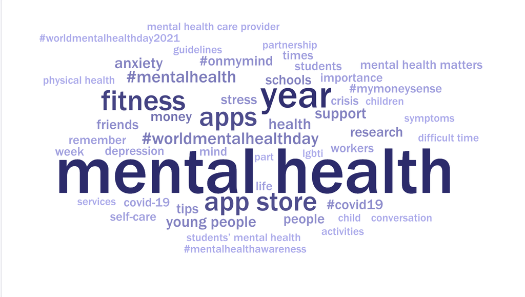 Le nuage de mots ci-dessous, représentant près de 60 000 tweets provenant de marques populaires et portant sur la santé mentale et le bien-être, montre que l'accent était mis sur la gestion du stress, de l'anxiété et de la dépression ainsi que, de manière générale, sur la sensibilisation à la santé mentale.