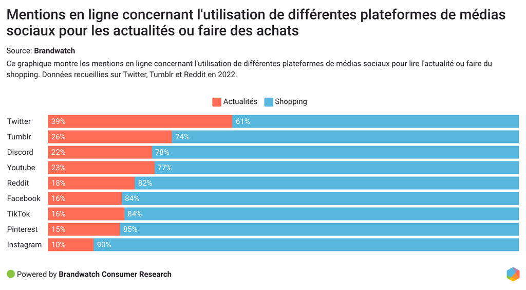 Les conversations en ligne sur l'utilisation des médias sociaux révèlent des différences intéressantes d'une plateforme à l'autre. Instagram, Pinterest et TikTok ont le pourcentage de mentions liées au shopping le plus élevé de l'ensemble des plateformes. Pour ce qui est des informations, c'est sur Twitter que l'on compte le plus.