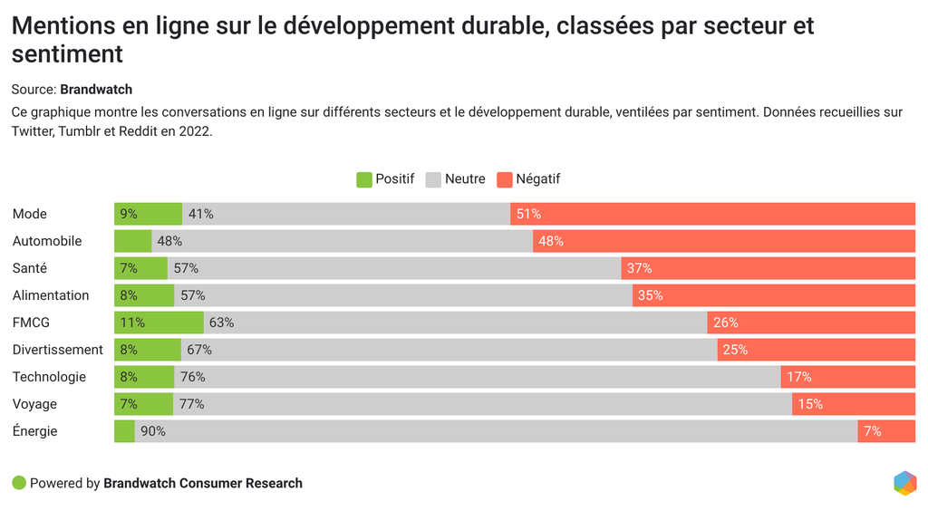 Les secteurs de la mode et de l'automobile sont ceux qui ont enregistré le pourcentage le plus élevé de mentions négatives en 2022. Le premier est particulièrement critiqué pour sa culture de la « fast fashion » et son impact négatif sur l'environnement, un point qui devrait être au cœur des stratégies des marques de mode en 2023.