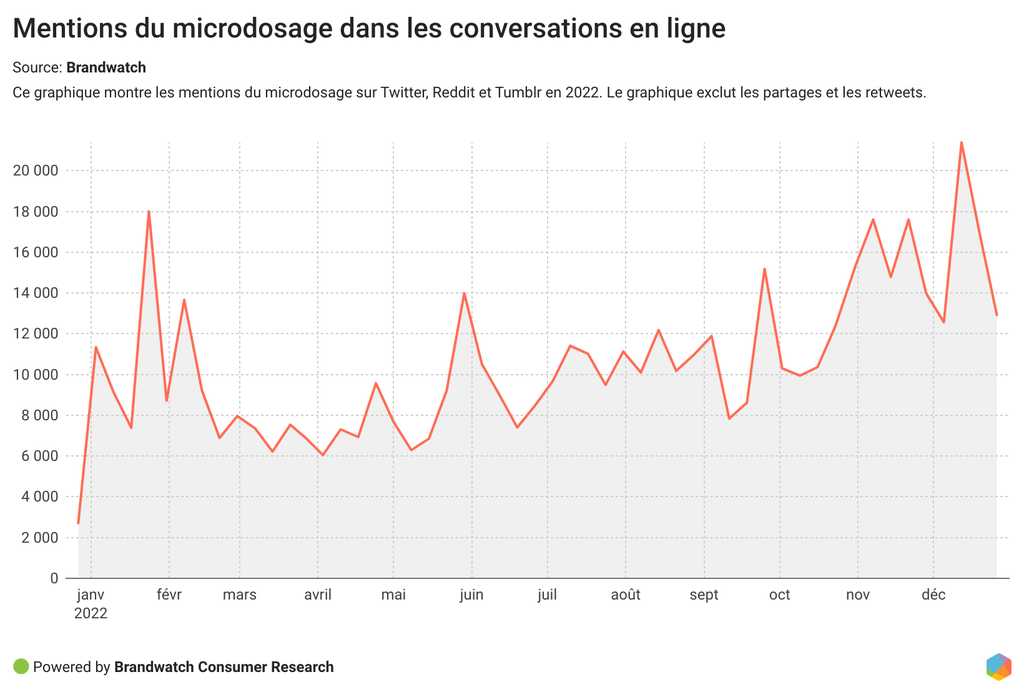 Les mentions en ligne consacrées au microdosage ont connu une progression constante tout au long de l'année 2022, avec un pic notable vers la fin de l'année.