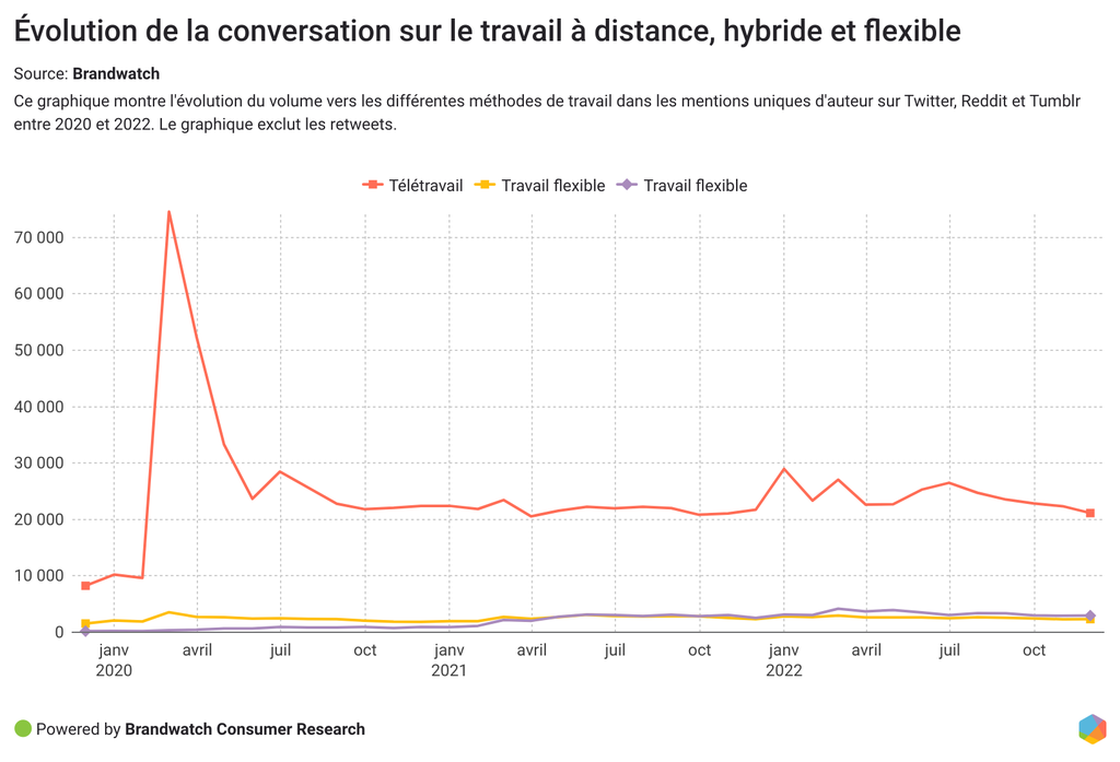 En utilisant Brandwatch Consumer Research, nous avons constaté que les travailleurs plébiscitaient le travail hybride, la conversation à ce sujet dépassant la conversation sur le travail flexible au cours du second semestre 2022.