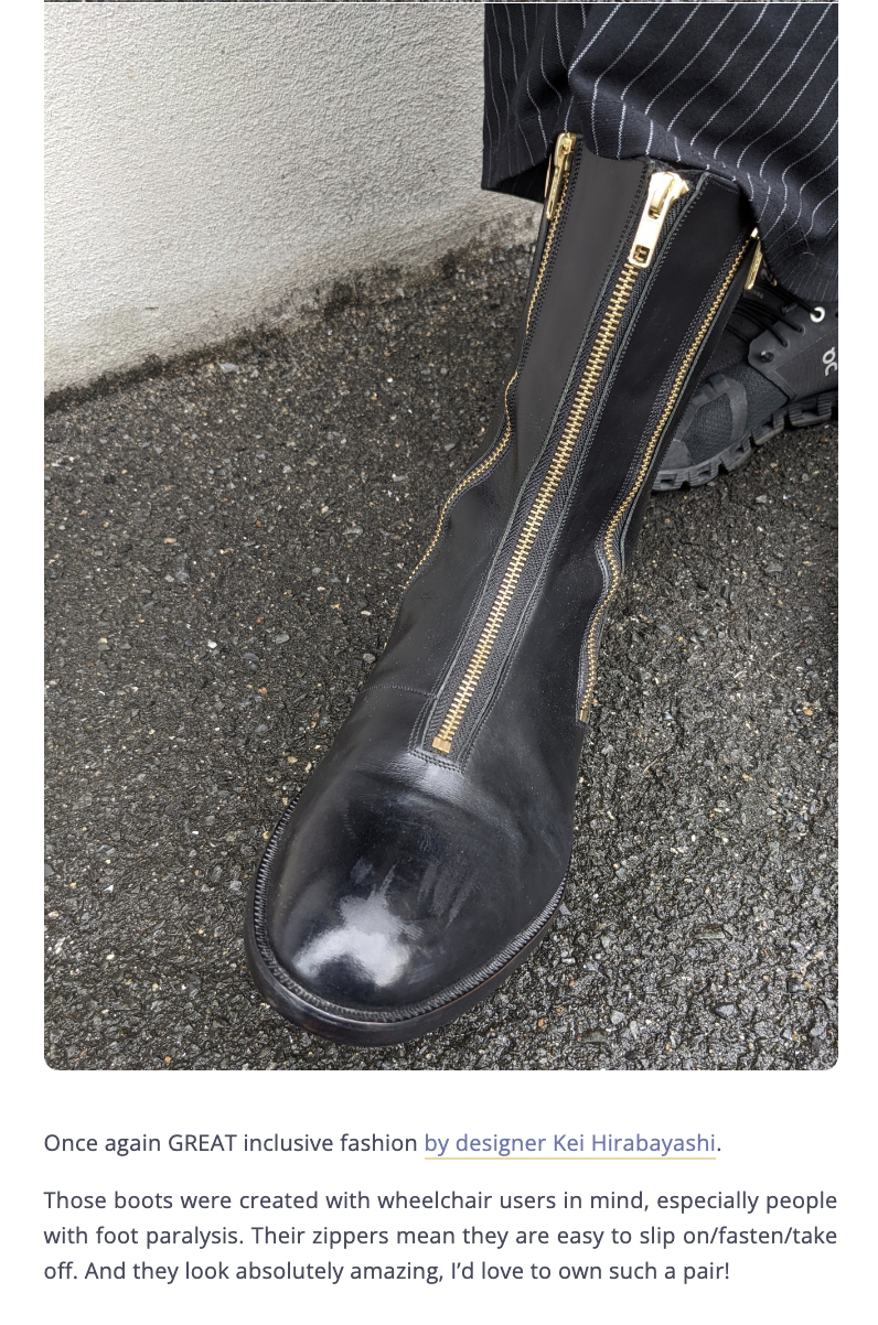 Les marques qui rendent les vêtements plus accessibles sont plébiscitées. Par exemple, ce post Tumblr faisant l'éloge des bottes du designer Kei Hirabayashi destinées aux personnes handicapées a été largement partagé en 2022, avec près de 14 600 commentaires publiés.