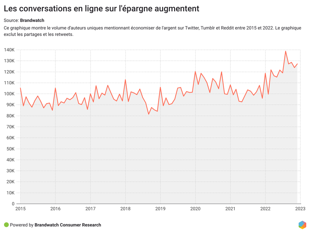 Pour contrer l'inflation, les gens cherchent à dépenser moins d'argent. Le nombre de conversations en ligne portant sur les économies d'argent a ainsi augmenté de 12 % en 2022 par rapport à 2021, et cet essor ne se dément pas.