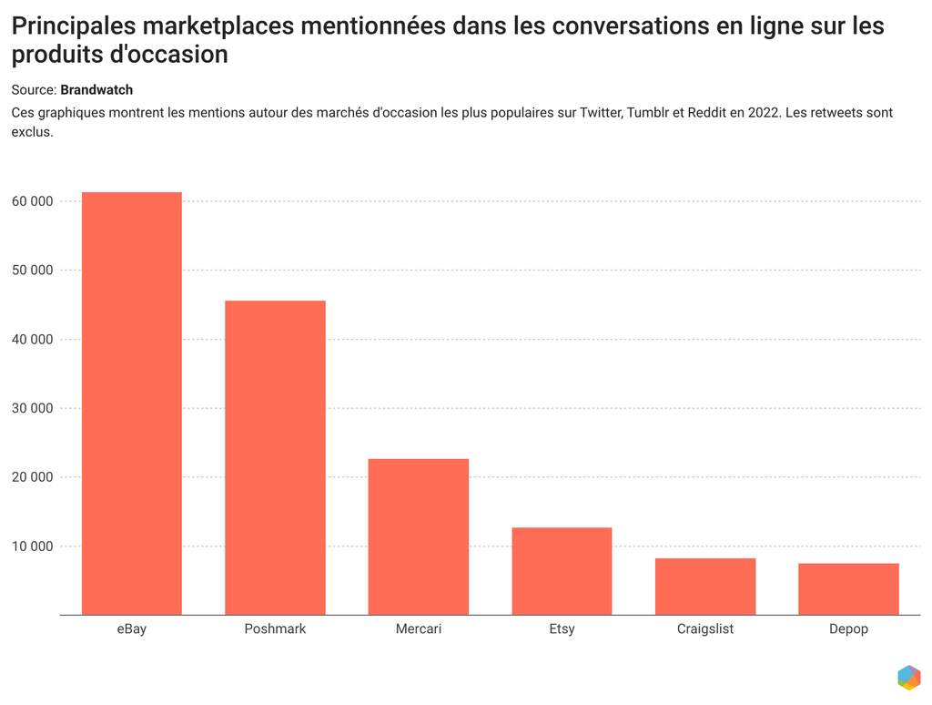 Où les consommateurs préfèrent-ils acheter ou vendre des produits d'occasion ? Si l'on décompose les conversations en ligne (en anglais) on constate que les marketplaces d'occasion les plus populaires sont eBay, Poshmark et Mercari.