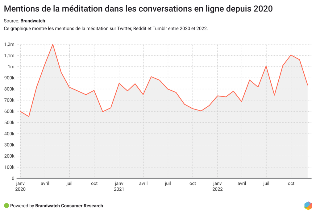 Toutefois, les mentions relatives à la méditation ont de nouveau atteint un pic vers la fin de l'année 2022. Bien qu'elles ne soient pas aussi nombreuses qu'au plus fort de la pandémie, elles ont néanmoins connu une augmentation notable.