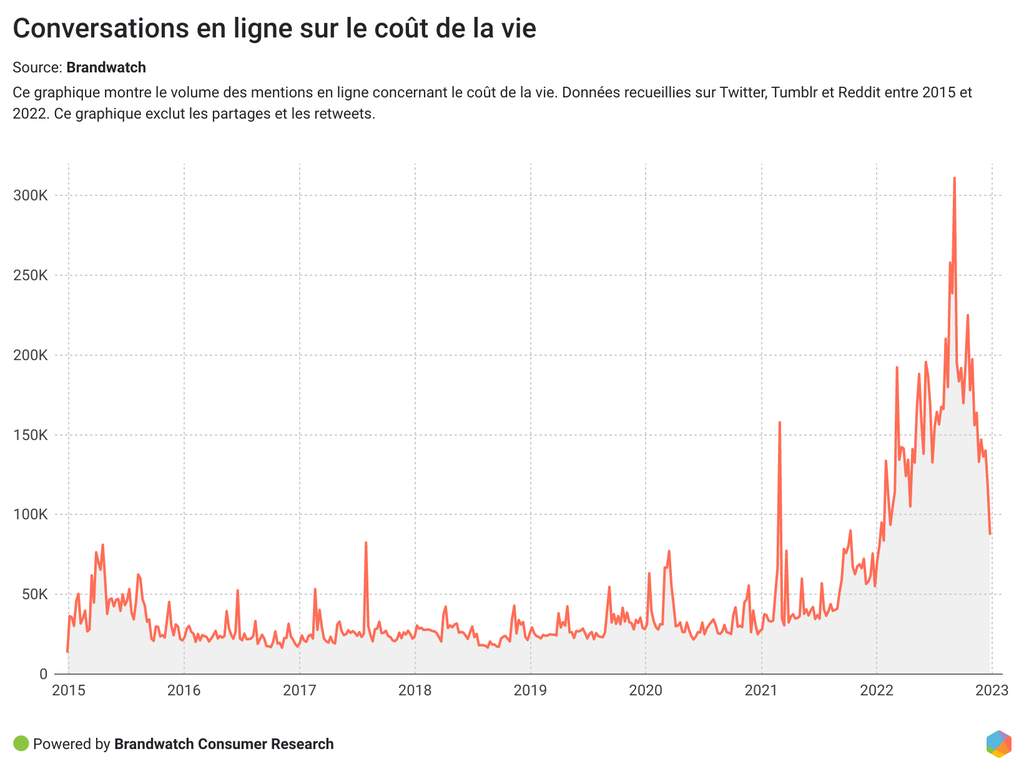 Selon Google Trends, l'intérêt pour le « coût de la vie » a atteint son plus haut niveau depuis 5 ans à la fin du mois de septembre 2022. Et selon Brandwatch Consumer Research, , les conversations sur ce même sujet ont augmenté de 97 % par rapport à l'année précédente.