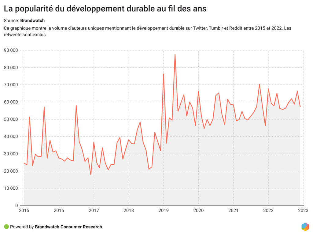 Nous avons examiné les conversations en ligne pour voir comment le débat sur la durabilité évoluait. En 2022, le nombre de personnes abordant le sujet a augmenté de 12 % par rapport à l'année précédente.