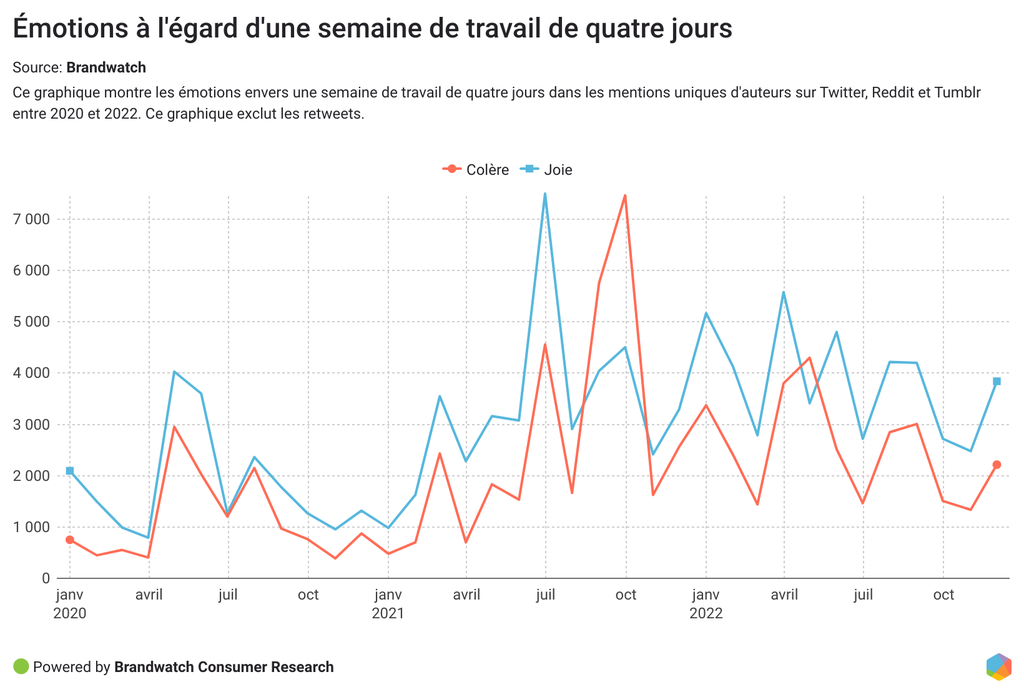 Le graphique ci-dessus montre les mentions de colère et de joie concernant la semaine de travail de quatre jours dans les conversations en ligne publiées depuis 2020.