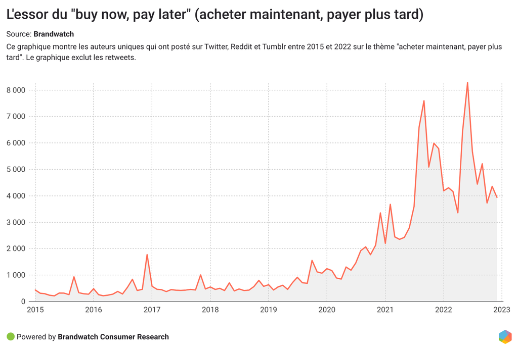 La conversation en ligne relative au paiement différé est montée en flèche parallèlement à l'augmentation des prix. C'est en 2022 que cette conversation a connu son plus grand essor, le nombre de mentions, même à son plus bas, restant supérieur à tous les pics de conversation enregistrés avant 2021.