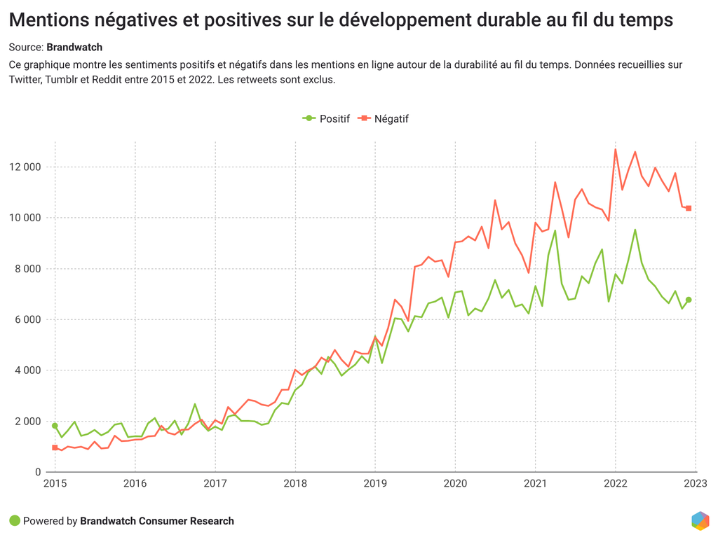 Cette tendance se retrouve également dans la manière dont les consommateurs évoquent la durabilité sur le Web. Si l'on décompose les conversations sur la durabilité en sentiments négatifs et positifs, on constate que l'écart entre les deux s'est creusé au fil des ans, les mentions négatives augmentant à un niveau plus élevé que les discussions positives.