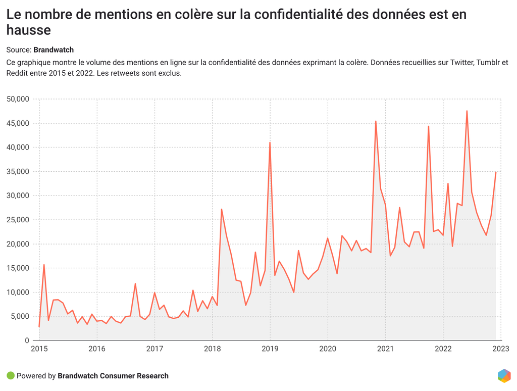 Cette préoccupation croissante se reflète également dans les recherches et les données social media. Selon Google Trends, l'intérêt pour la « confidentialité » a atteint son plus haut niveau depuis cinq ans à la fin du mois d'octobre 2022. En outre, les conversations en ligne sur les données personnelles et la confidentialité ont augmenté de 17 % en 2022 par rapport à l'année précédente.