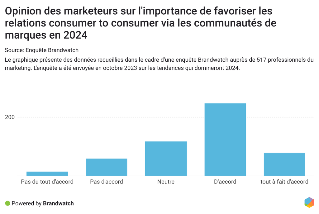 Les spécialistes du marketing ressentent également la même chose. Dans notre enquête Brandwatch, 63 % des spécialistes du marketing sont d'accord pour dire que les marques s'appuieront sur la promotion des relations entre les clients via les communautés en 2024.