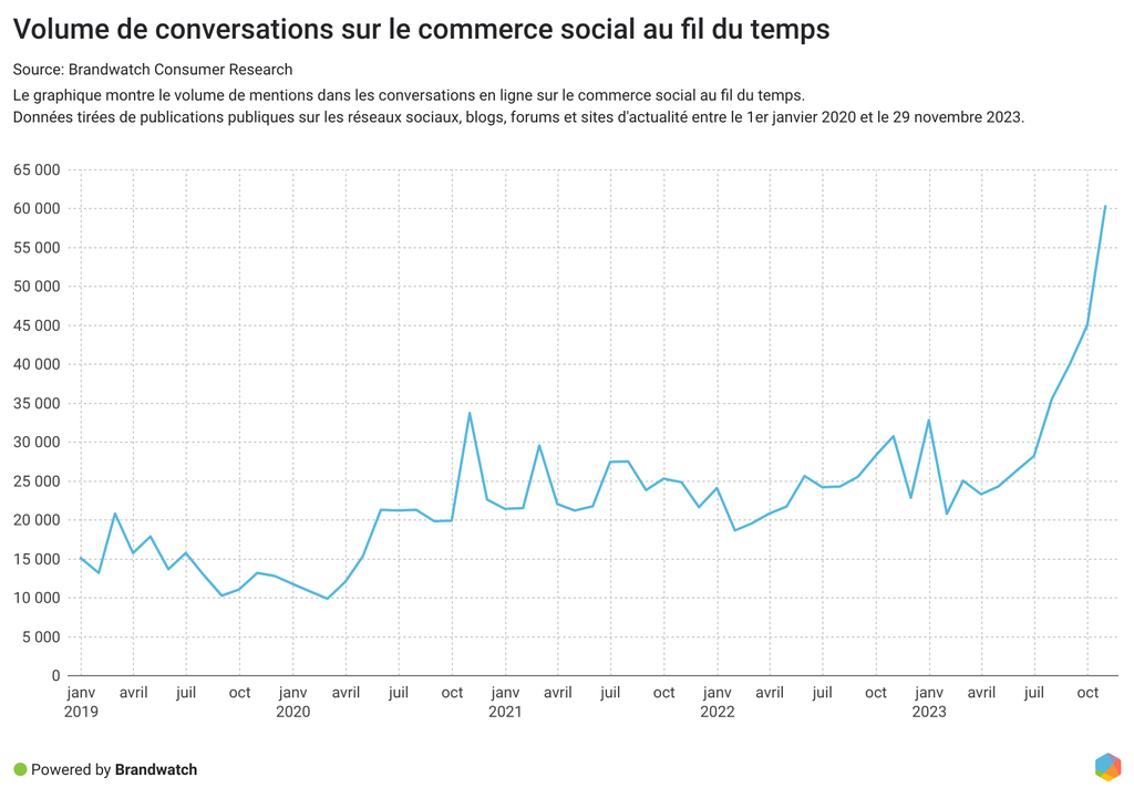 Les discussions en ligne sur le commerce social ont augmenté de 36 % de janvier à novembre 2023 par rapport aux onze mois précédents, et le volume de mentions a atteint un pic en novembre 2023. Dans ces discussions, les marques discutent de la façon d'implémenter le commerce social dans leurs stratégies, et les consommateurs s'intéressent à la façon dont cela pourrait affecter leurs parcours clients.