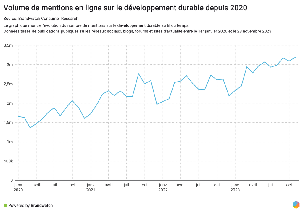 L'année 2023 a été marquée par l'augmentation la plus importante des mentions de développement durable, en hausse de 20 % entre le 1er mai et le 28 novembre 2023 par rapport à la période précédente.