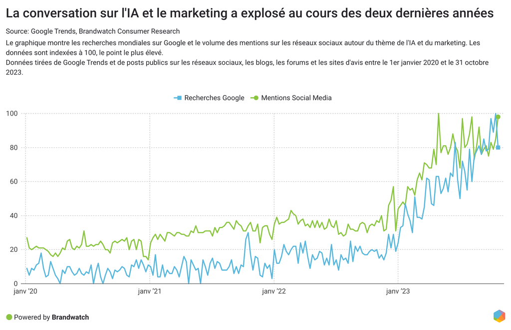 Selon une étude de Gartner, seulement 8 % des clients ont utilisé un chatbot lors de leurs interactions récentes avec un service client. Malgré leurs défauts, la faible adoption des chatbots semble être une occasion manquée pour les spécialistes du marketing : nous avons enregistré une augmentation de 85 % des mentions joyeuses relatives à l'IA et aux chatbots entre le 1er avril et le 1er octobre 2023.