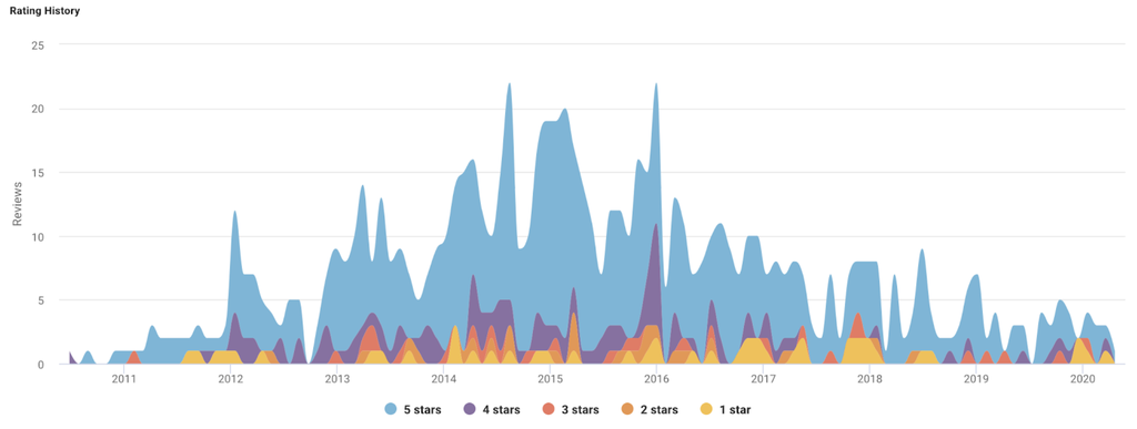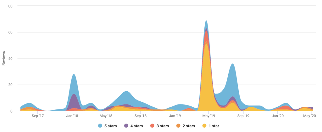 In this chart we’ve analyzed nine year’s worth of reviews for a microphone. Since 2017 we can see five star reviews have started to drop off, but the volume of one or two star reviews is still consistent. At this rate we can predict a significant number of future reviews will be negative.