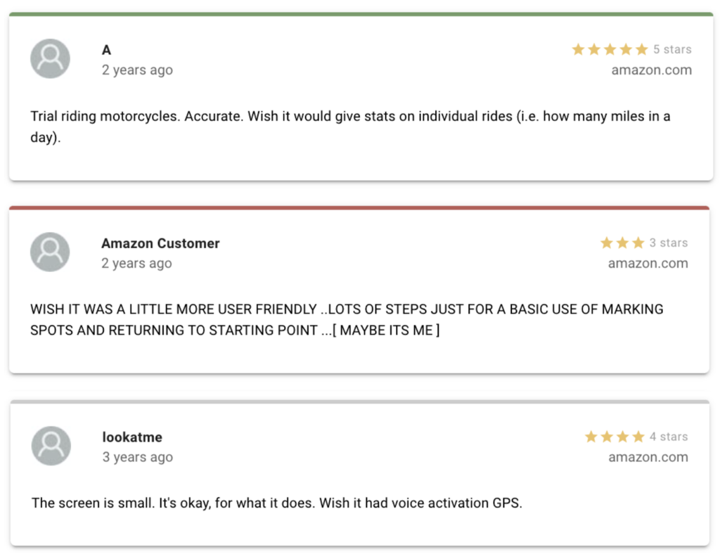 For the Garmin eTrex, we’ve applied a filter to only show reviews containing the phrase “I wish”. It reveals some of the features customers want.