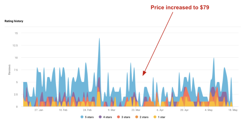 For this product, the optimized price point is within the $60 – $65 range. The data shows that increasing the price to this point maintained customer satisfaction. However, increasing the price to $79 led to a decline in reviews, star ratings, and customer sentiment.